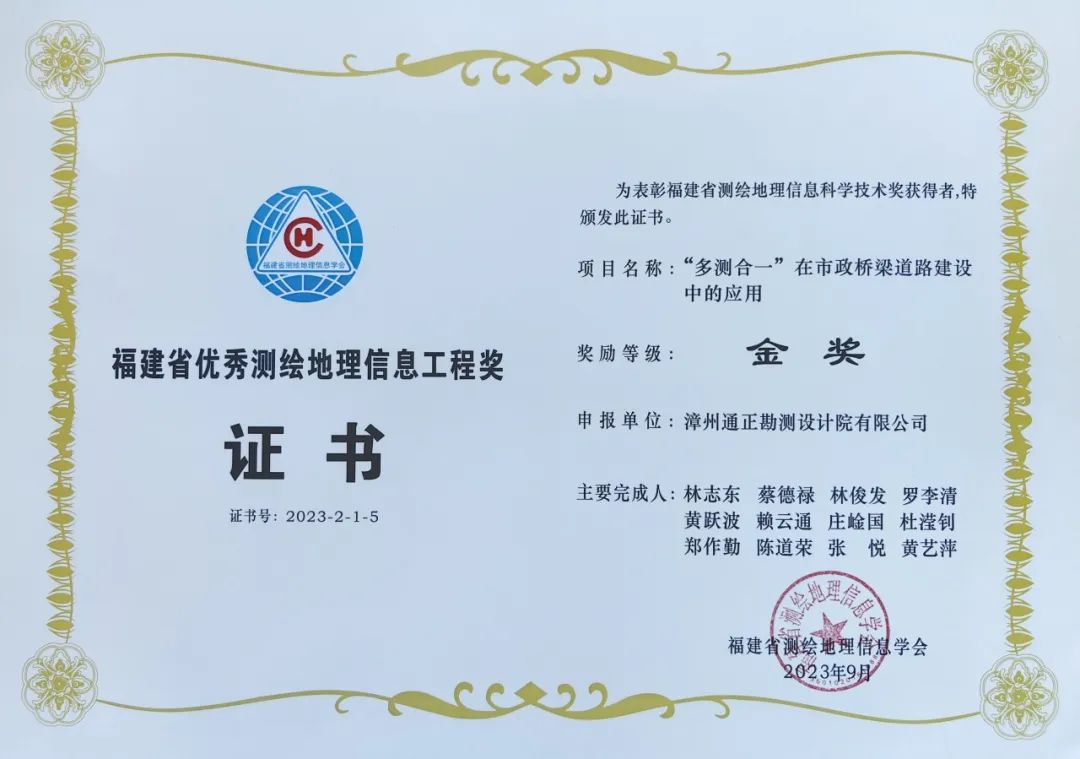 此次獲獎,是福建省測繪地理信息主管部門對通正公司測繪地理信息工作的充分肯定,也為“多測合一〞在市政工程建設領域中的應用與推廣提供了借鑒經(jīng)驗。