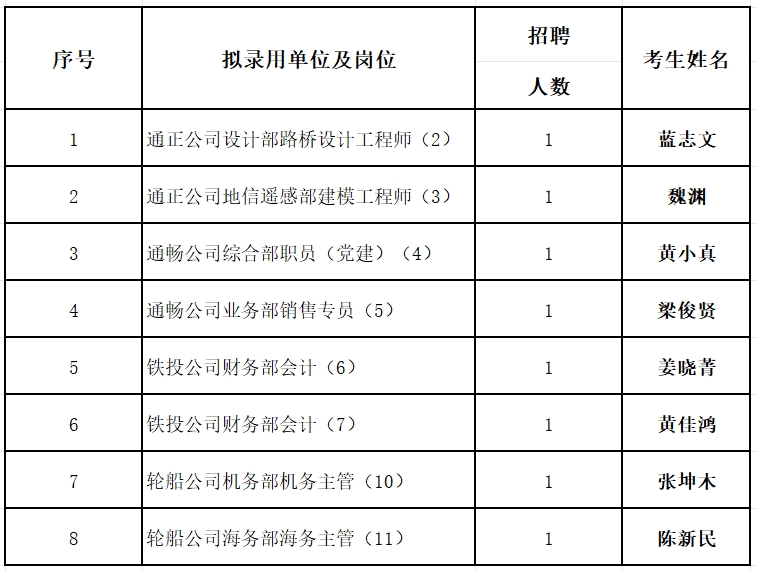 根據(jù)《漳州市交通發(fā)展集團(tuán)有限公司2023年“人才漳州月”赴外公開招聘公告》的相關(guān)規(guī)定,經(jīng)資格審查、初面、復(fù)面、體檢、政審等程序,現(xiàn)將擬錄用8名人員予以公示,公示時間為2024年1月19日至2024年1月25日(五個工作日)。公示期間歡迎群眾來電、來信、來訪反映情況。