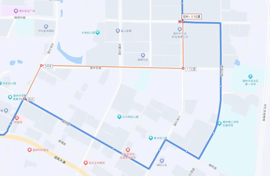 雙向取消檀林路運(yùn)營(yíng),改道龍祥北路、漳華東路、小港北路運(yùn)營(yíng)。(圖紅色線為臨時(shí)改道部分)