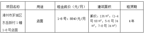 漳州市東岳新村1幢1-8號店面承租人?,F(xiàn)將具體事項公告如下:一、租賃標(biāo)的物(標(biāo)的物以現(xiàn)狀為準(zhǔn)):