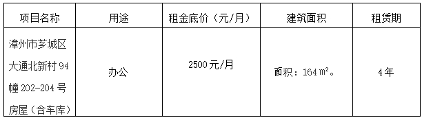 漳州市大通北新村94幢202-204號房屋承租人?,F(xiàn)將具體事項公告如下:一、租賃標的物(標的物以現(xiàn)狀為準):