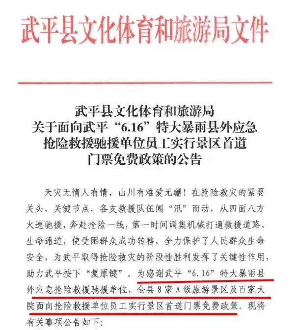 為感謝武平“6·16”特大暴雨縣外應急搶險救援馳援單位,近日,武平縣文旅局發(fā)布公告,即日起至今年年底,全縣8家A級旅游景區(qū)及百家大院面向搶險救援單位員工實行景區(qū)首道門票免費政策。