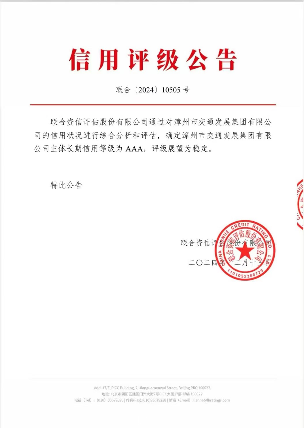 聯(lián)合資信是國內(nèi)最專業(yè)、最有影響力、最具權(quán)威的信用評級機構(gòu)之一。聯(lián)合資信授予漳州交通集團AAA信用等級的認(rèn)證,充分體現(xiàn)了國內(nèi)信用領(lǐng)域?qū)φ闹菔薪煌òl(fā)展集團有限公司綜合實力、信用水平、運營能力、轉(zhuǎn)型升級和發(fā)展前景等方面的高度認(rèn)可。