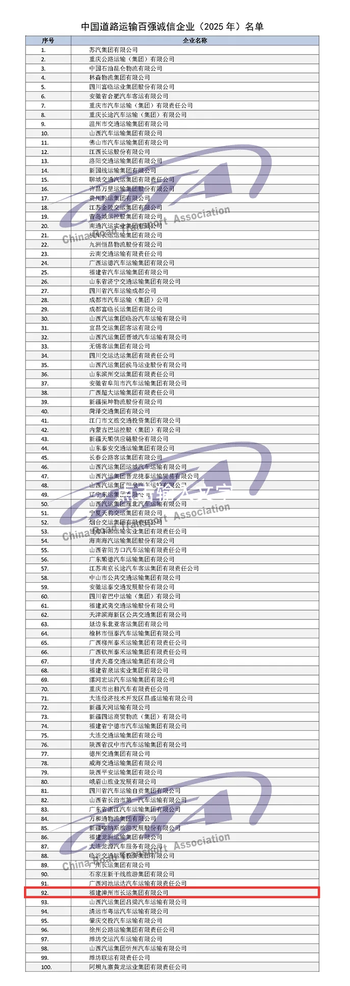 “中國道路運輸百強誠信企業(yè)”評價體系涵蓋企業(yè)規(guī)模實力、創(chuàng)新能力、社會公信及誠信經(jīng)營等維度,由中國道路運輸協(xié)會主辦,是行業(yè)貫徹中央關(guān)于建設(shè)交通強國、推動現(xiàn)代流通體系發(fā)展決策部署的重要實踐,是國內(nèi)道路運輸行業(yè)最具權(quán)威性和公信力的品牌活動之一。