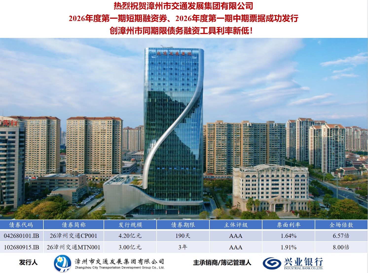 其中,短期融資券發(fā)行期限190天,票面利率1.64%,較公司上筆同品種債券利率下降25個基點,全場認(rèn)購倍數(shù)達(dá)6.57倍;中期票據(jù)發(fā)行期限3年,票面利率1.91%,較公司上筆同品種債券利率下降12個基點,全場認(rèn)購倍數(shù)達(dá)8.00倍。本期債券發(fā)行利率雙雙創(chuàng)下漳州市同品種債券歷史新低!