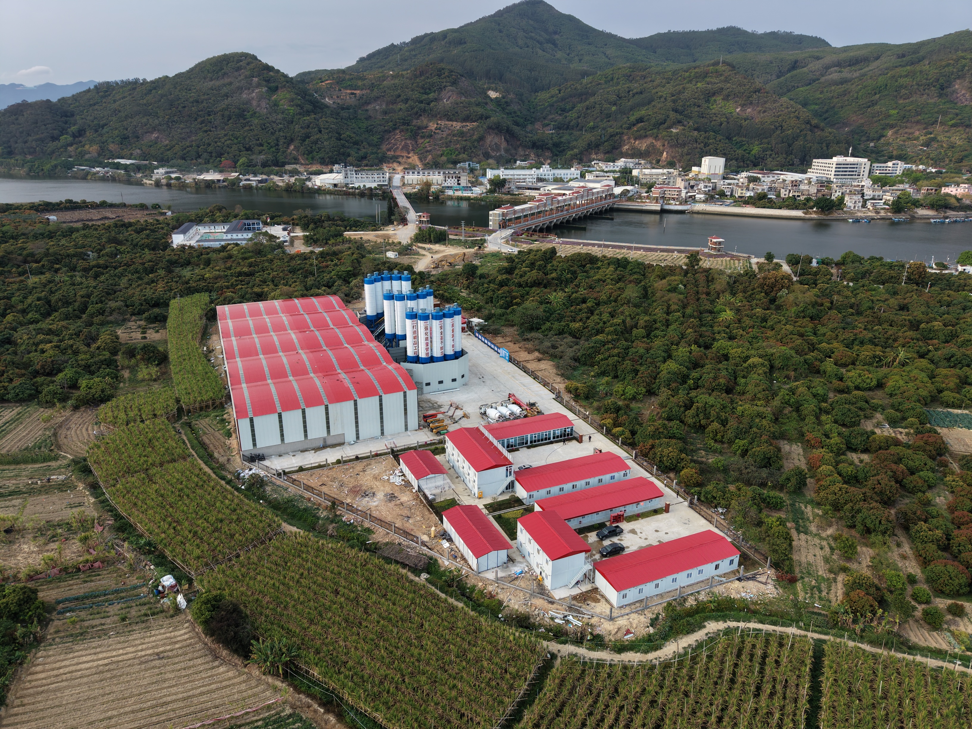 該拌和站位于云霄縣東廈鎮(zhèn)佳洲島,占地23.4畝,承擔(dān)標(biāo)段內(nèi)47.5萬方混凝土的生產(chǎn)任務(wù),主要供應(yīng)大臣山隧道、佳洲島特大橋、云霄互通匝道橋及附屬工程。站內(nèi)配置3臺HZS120型拌合機,配套15個150噸粉罐,設(shè)10個骨料倉及1套發(fā)電機組,并分區(qū)布設(shè)混凝土拌和區(qū)、砂石料存放區(qū)、物料監(jiān)控室、工地試驗室、辦公區(qū)和生活區(qū),功能完備,保障有力。